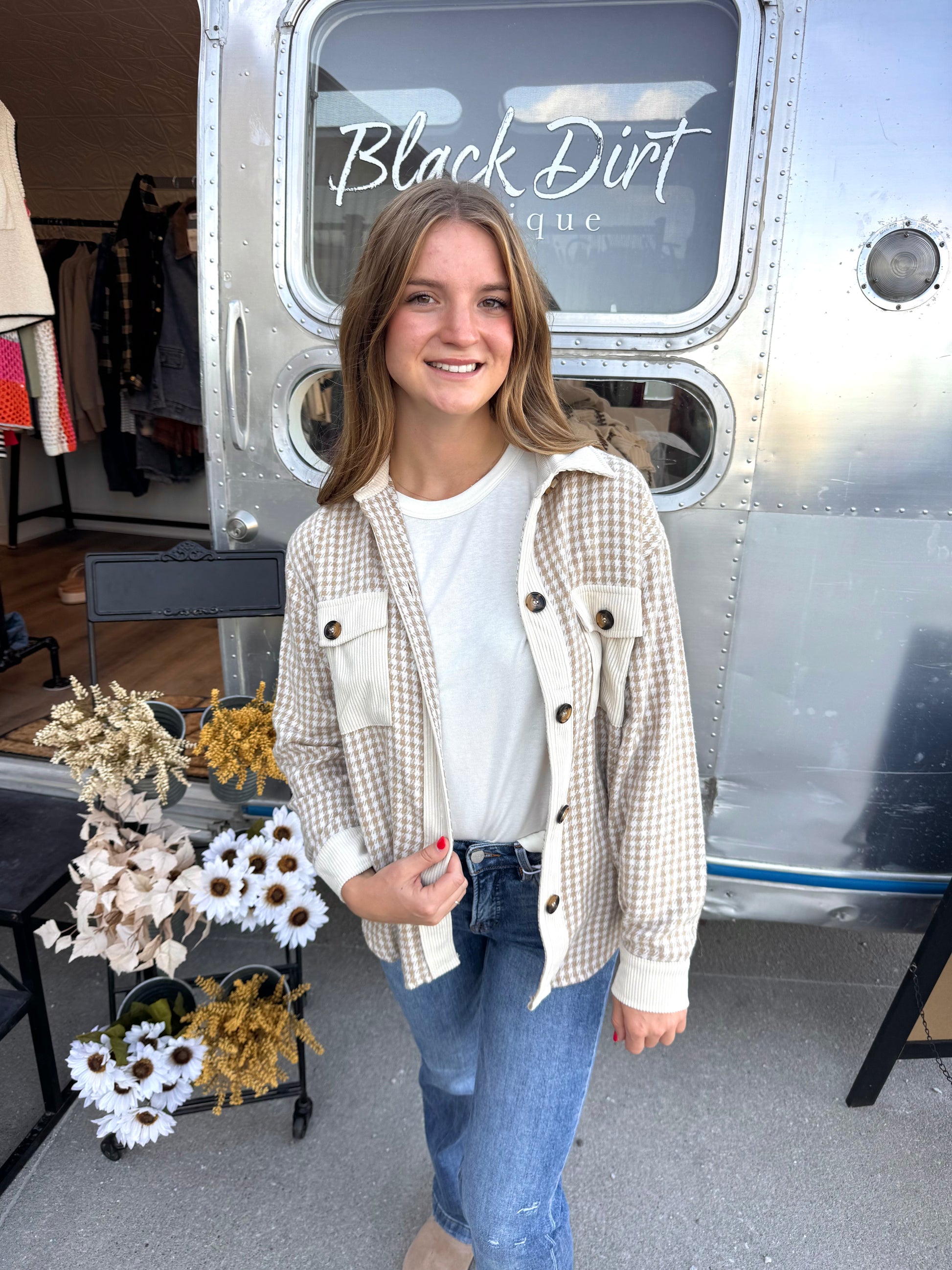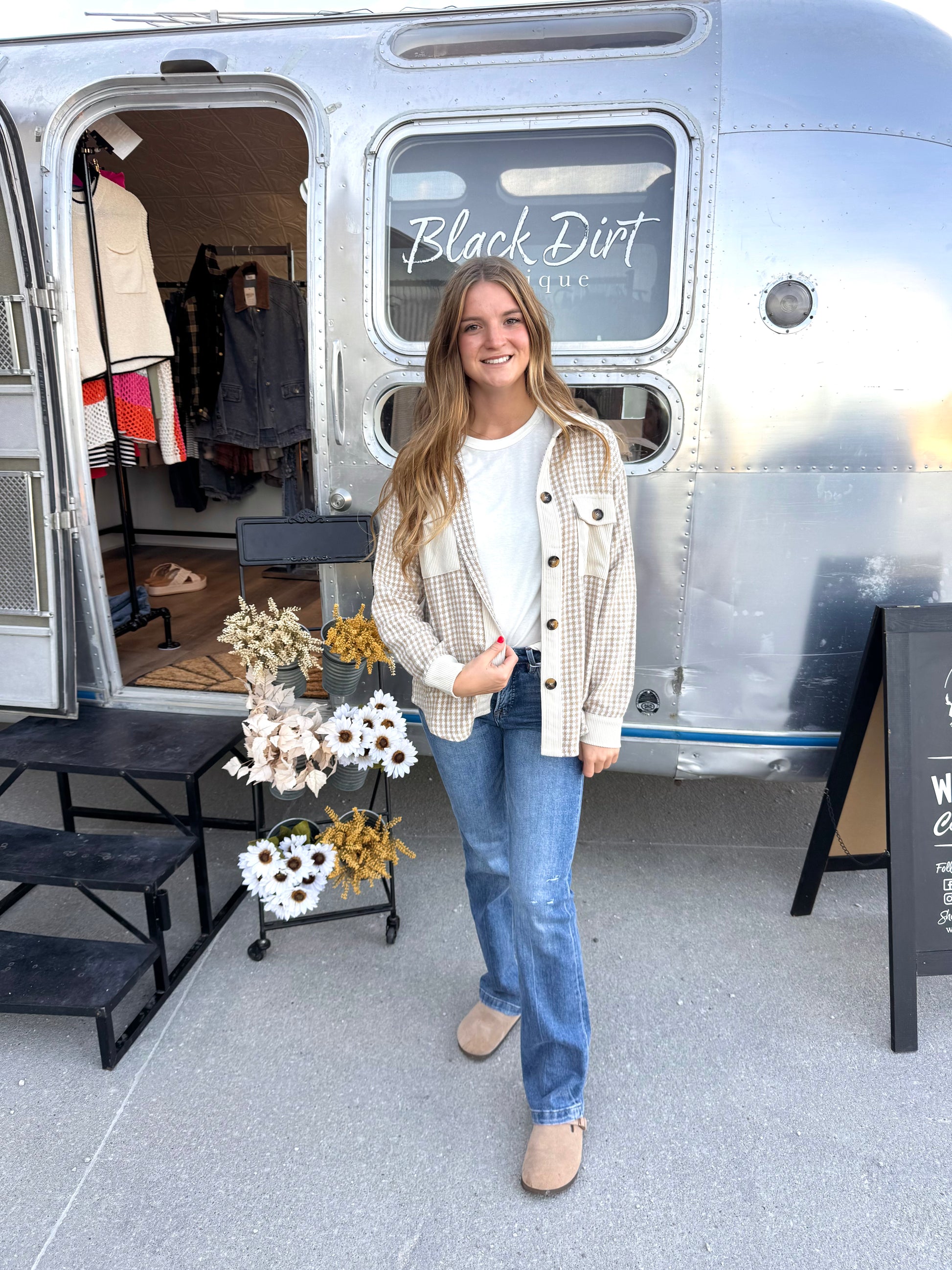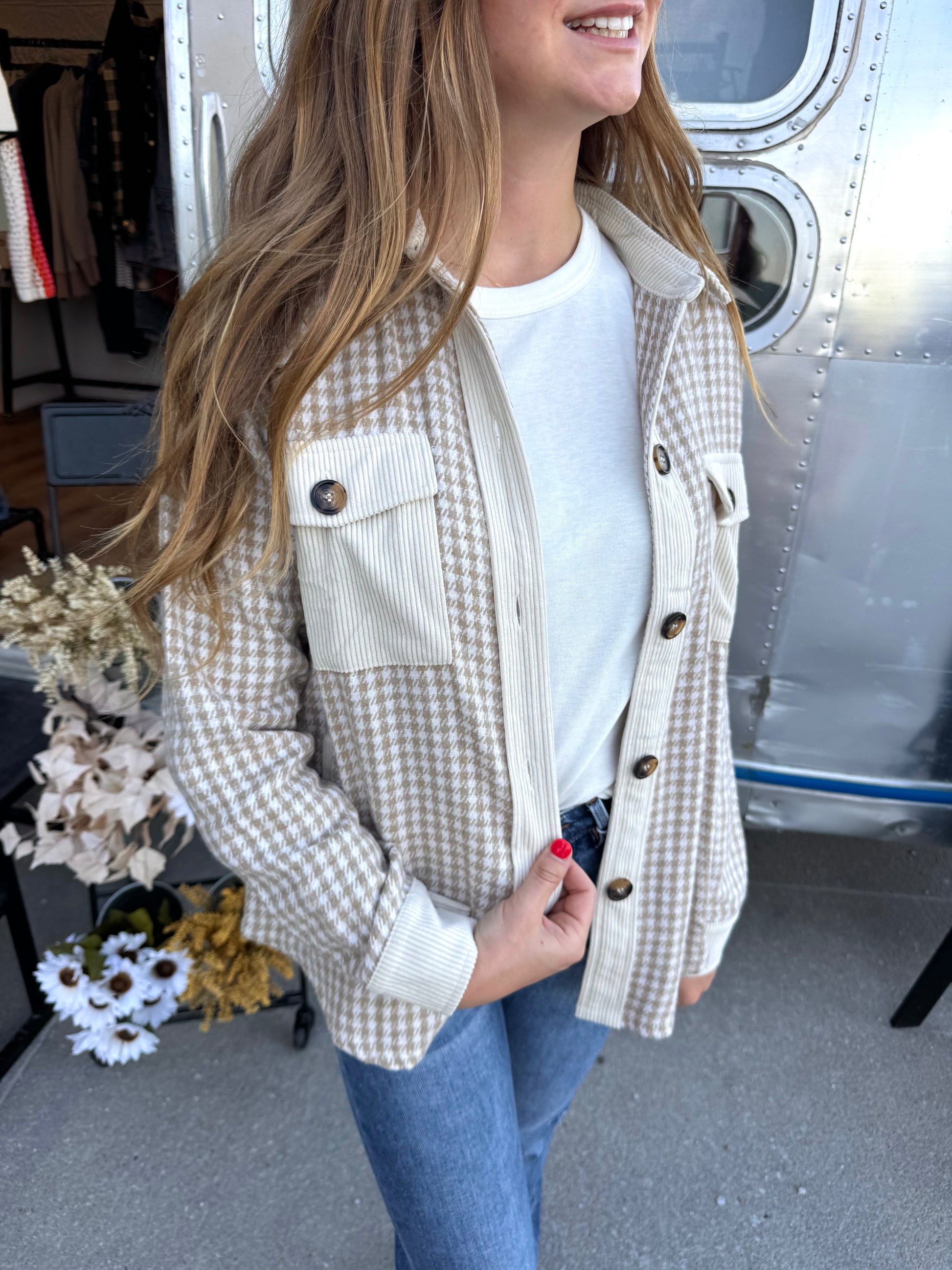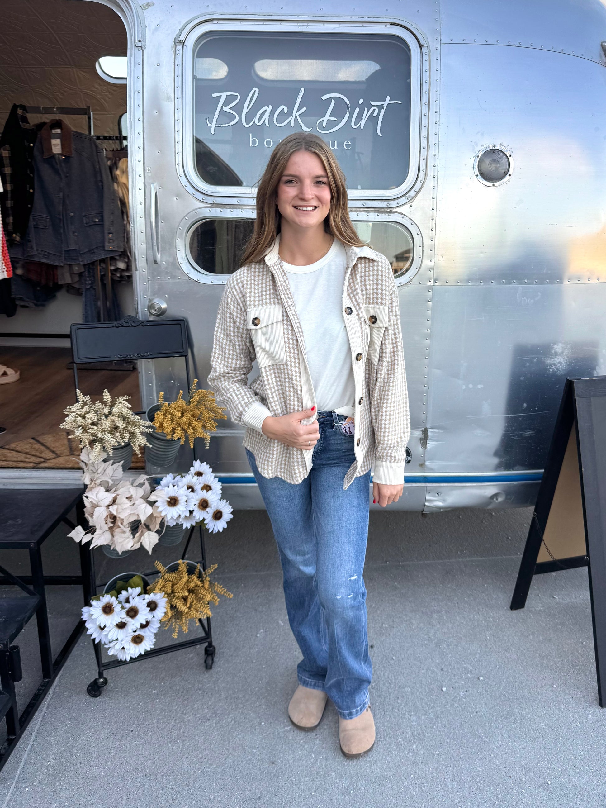This Checkerteer shacket features a color-contrasted design, double chest pockets, long sleeves, and a button-down front. It also includes convenient side pockets for added functionality. Beige in color.