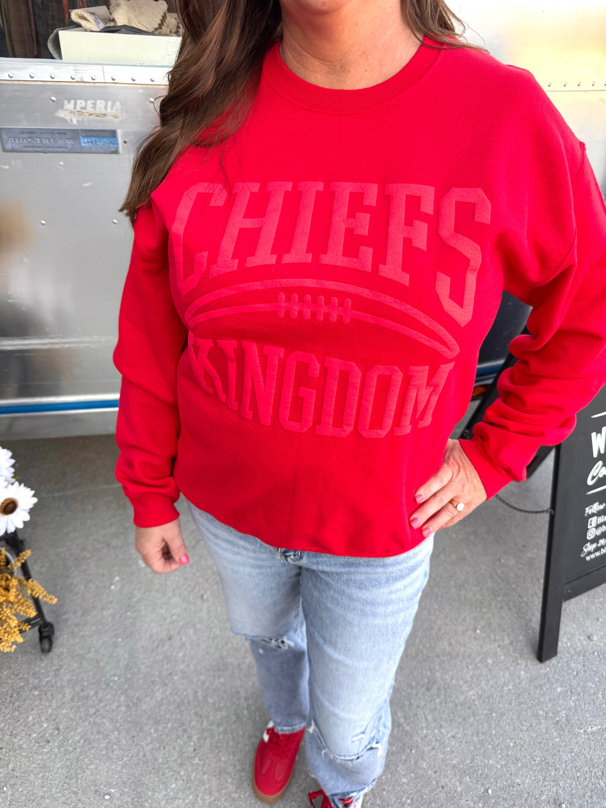 This monochrome puff print is on a Gildan crewneck. Let's go Kansas City- obvi the midwest's best pro football team.