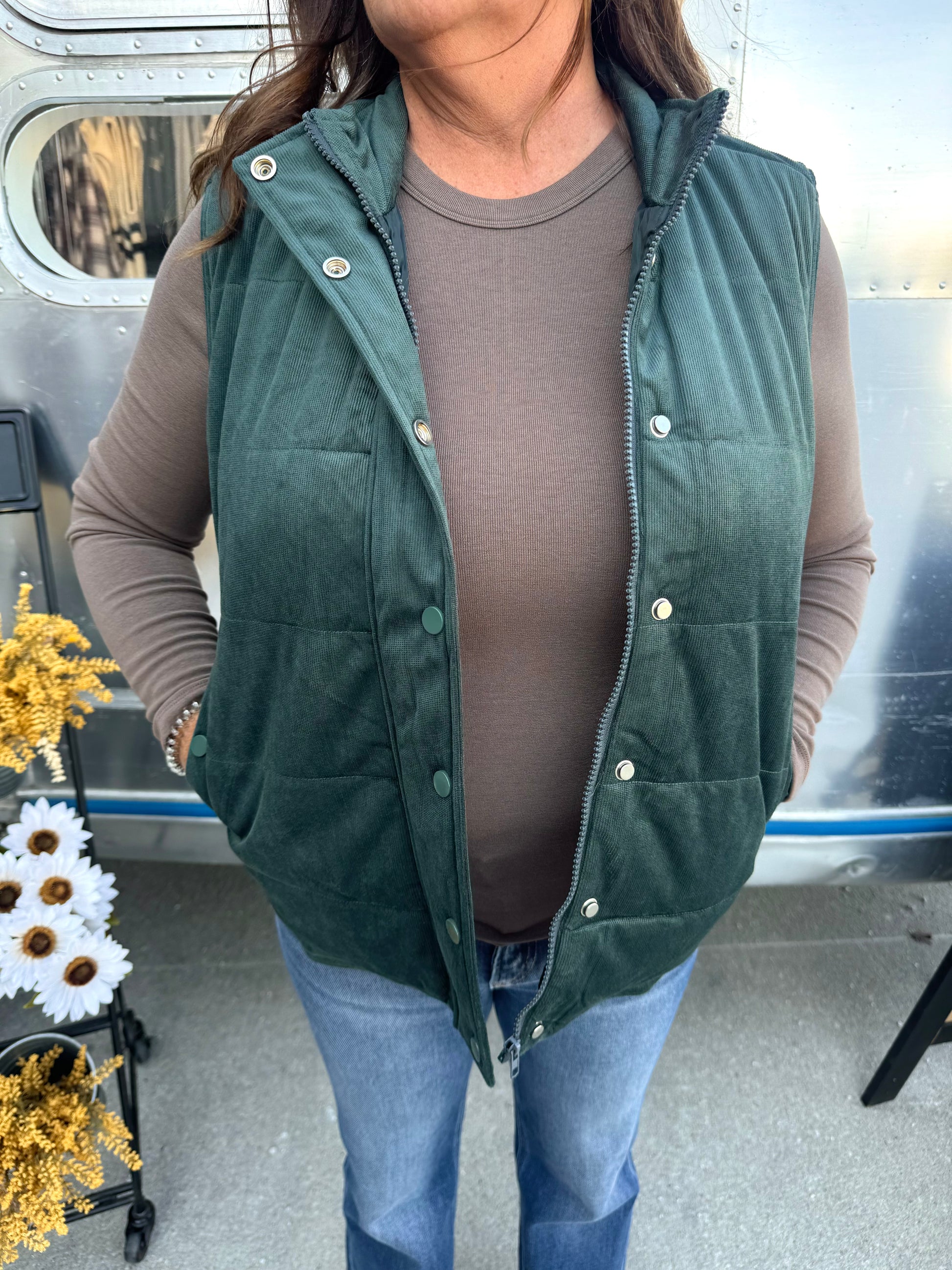 This mini corduroy puffer vest features a cozy polar neck, a concealed zip closure complemented by snap buttons, and convenient pockets for added functionality. Offered in sage green or mocha.