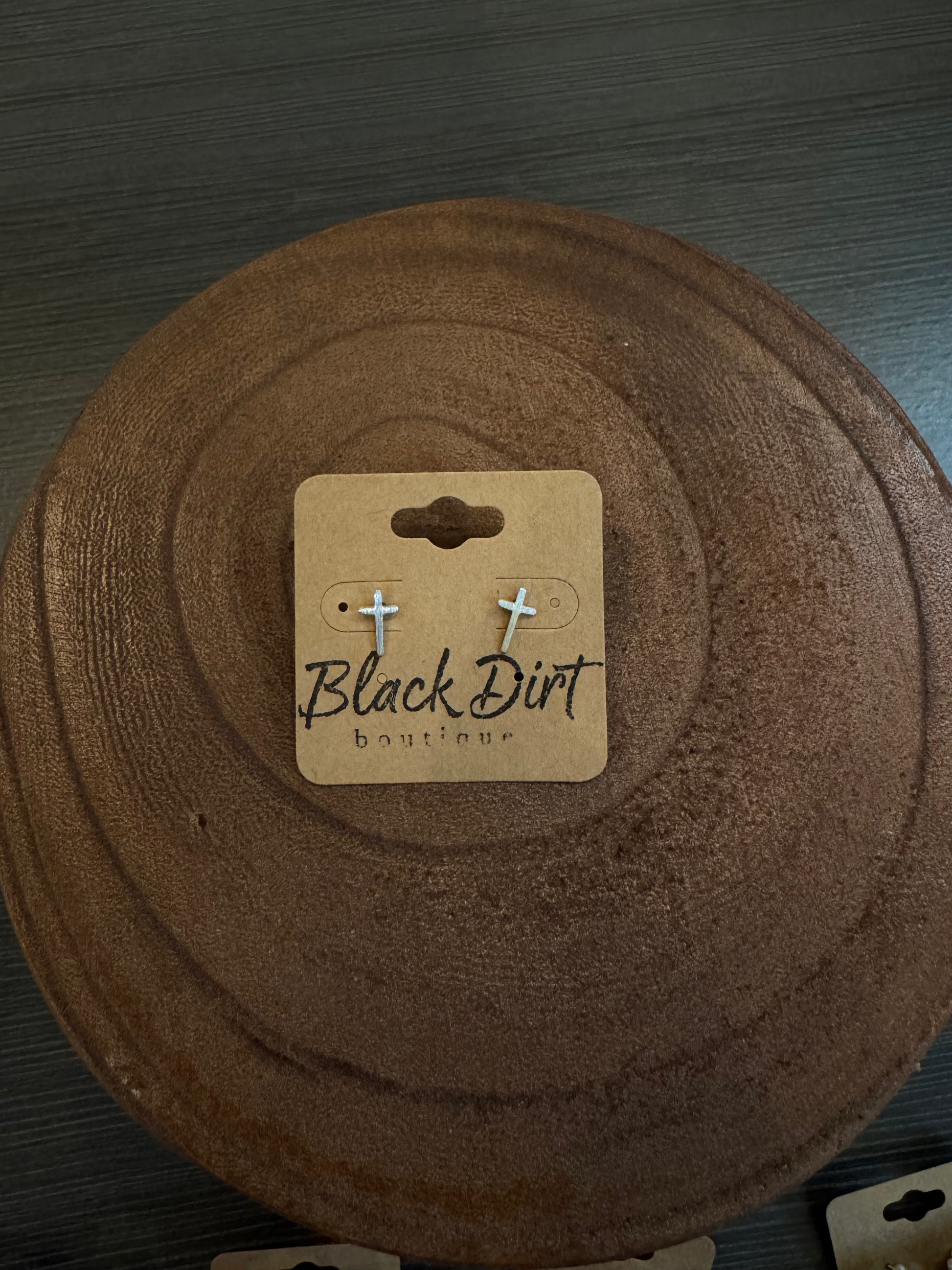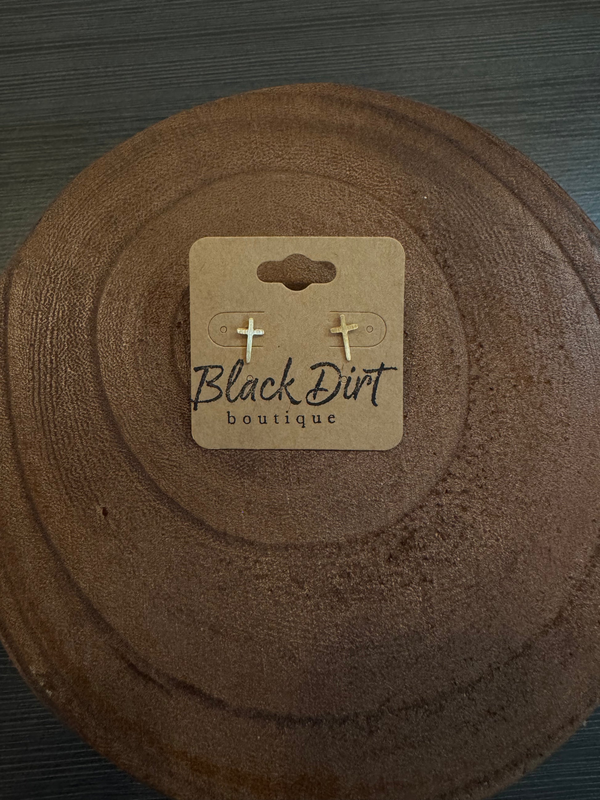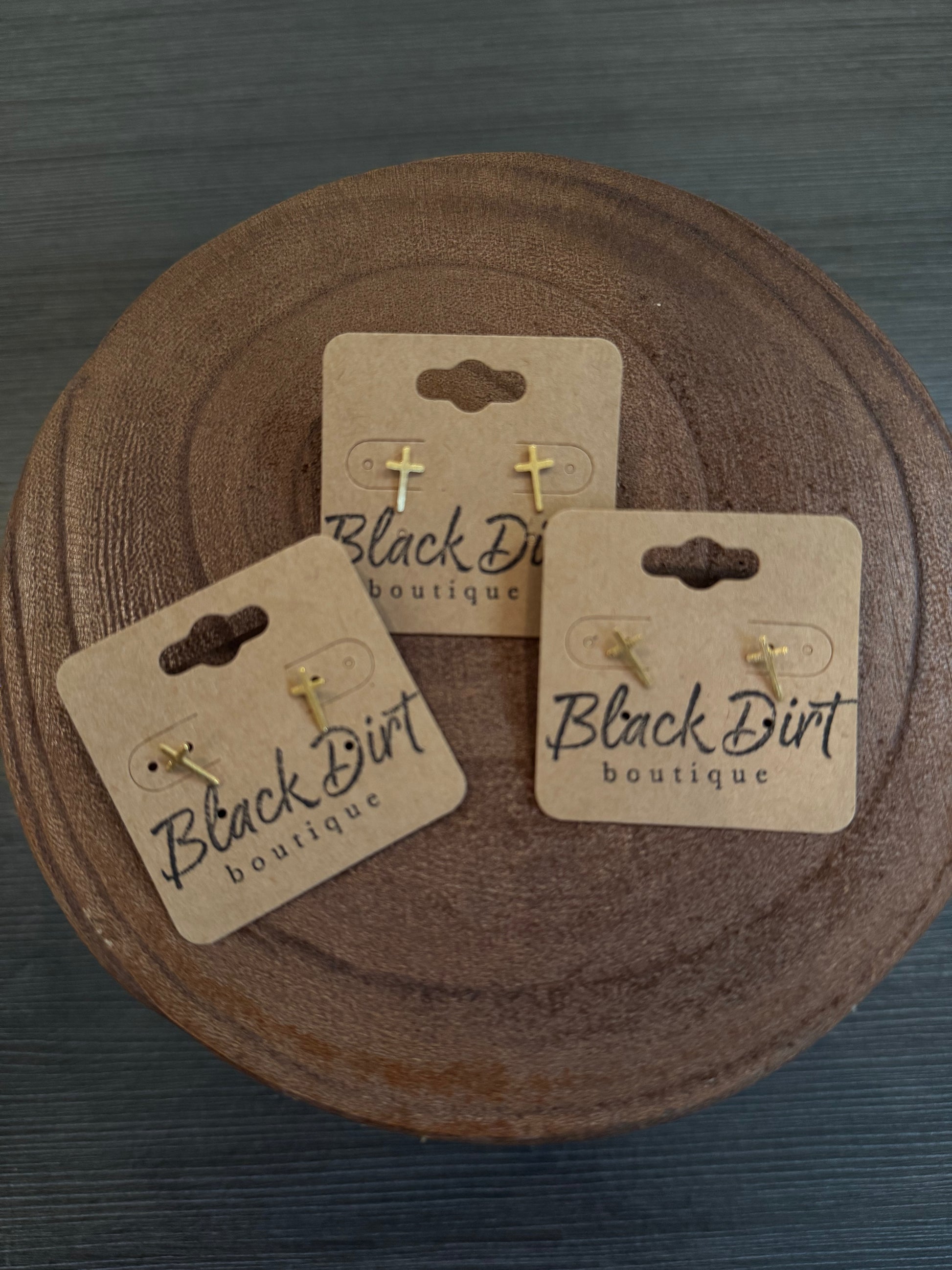 Mini cross stud earrings. Comes in two finishes- gold or silver. Great for all ages.