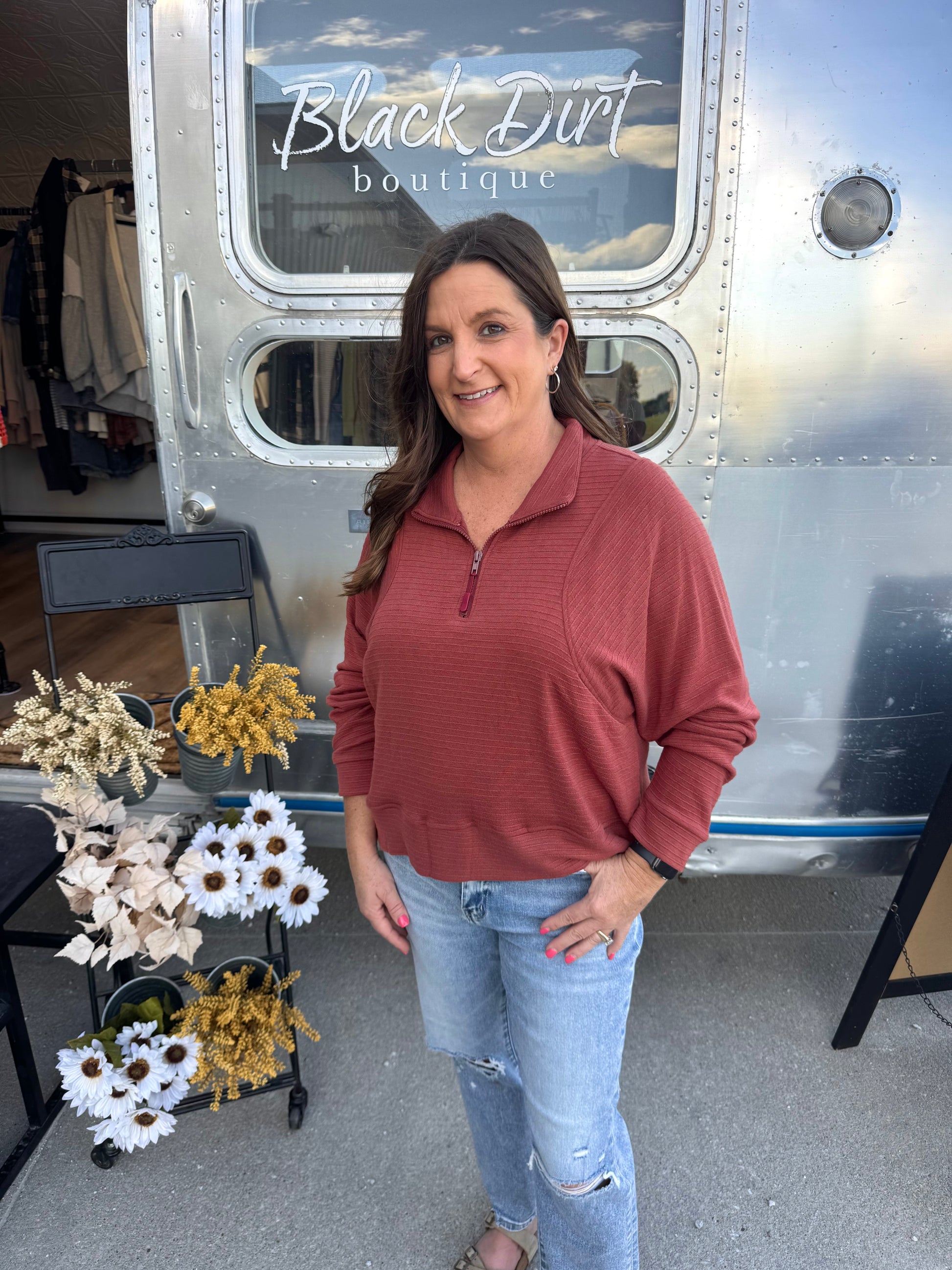 This half zip-up showcases a trendy stripe textured fabric that adds a contemporary touch. The long sleeves with gently dropped shoulders provide a relaxed fit, while the soft and lightweight fabric makes it perfect for wearing throughout the year. Fits true to size, not cropped and is versatile!