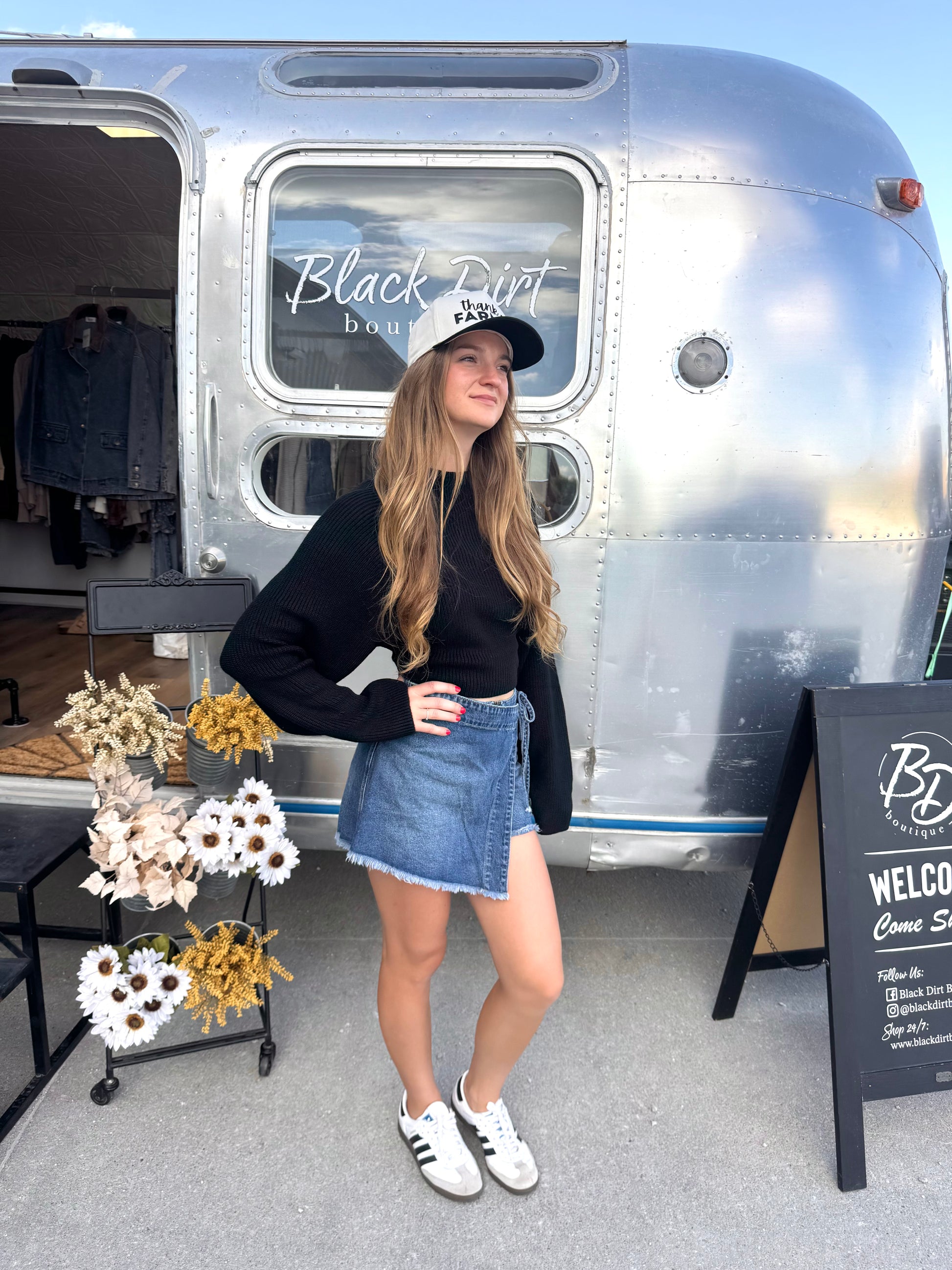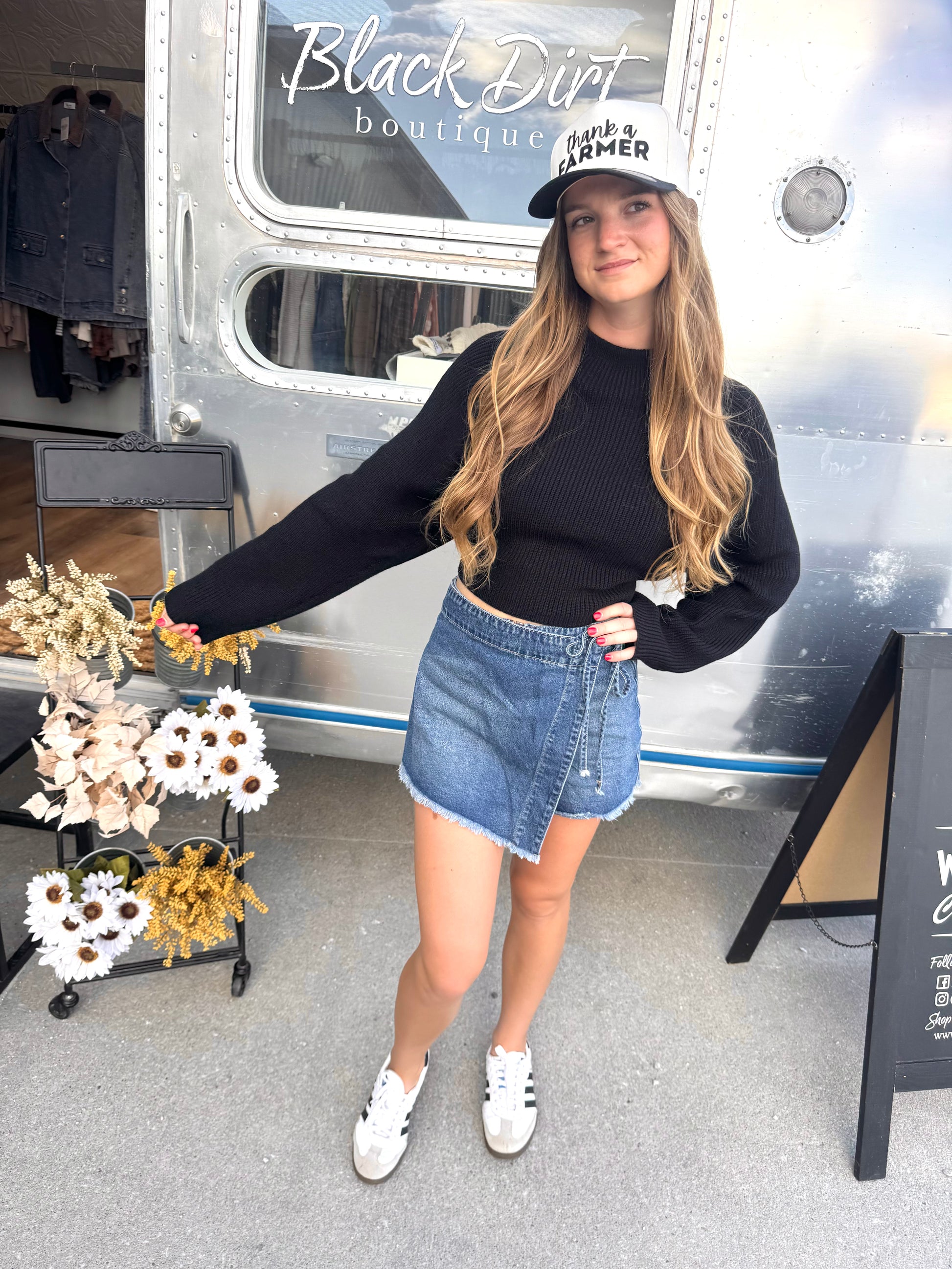 This long-sleeved knit top features a high mock neck and a striking open back with wide knit ties that tie into a bow. Its ribbed texture and center back seam add structure, blending coverage with stylish exposure for an elegant look. Super soft, true to size, & hits at the waist.