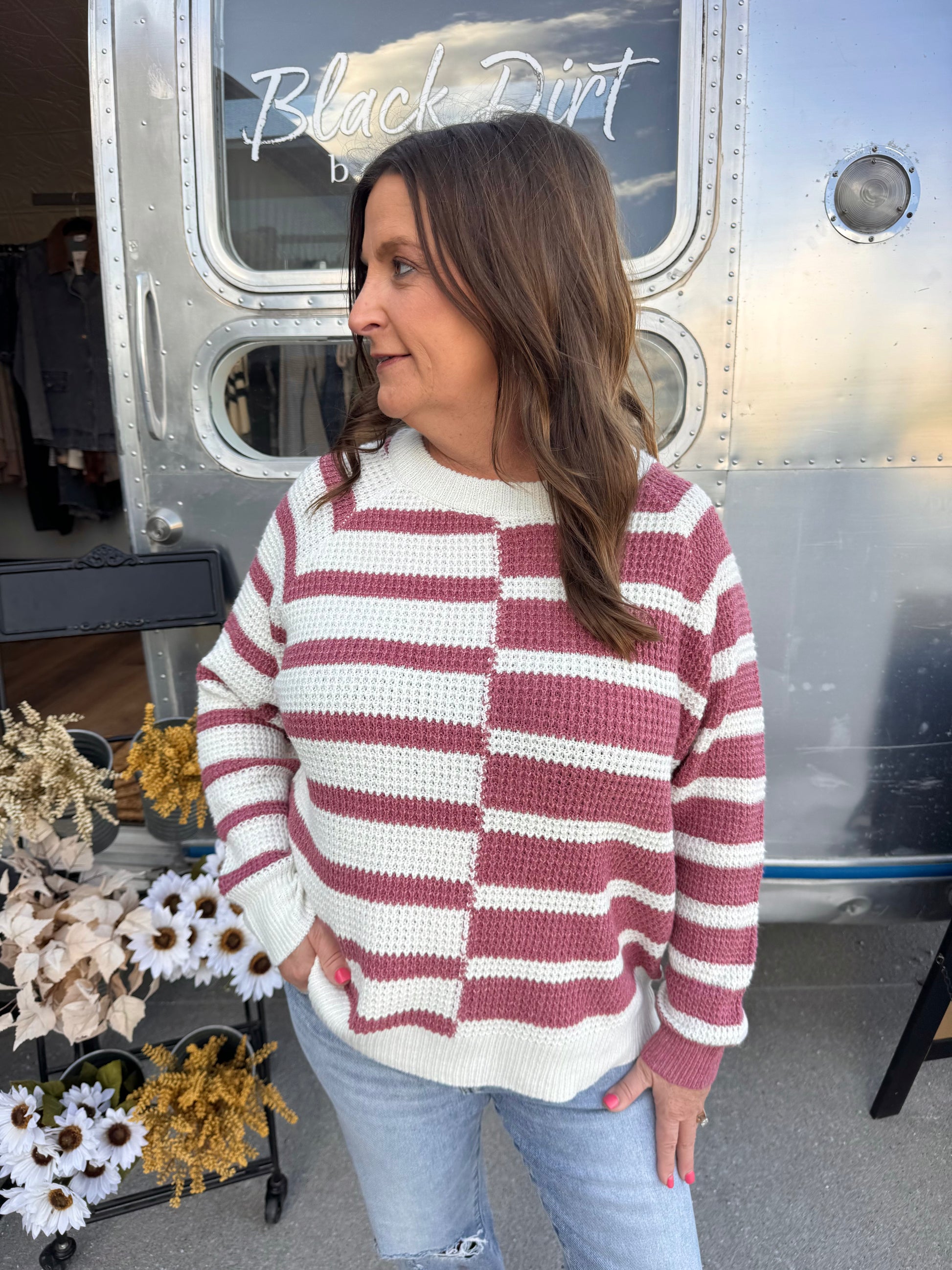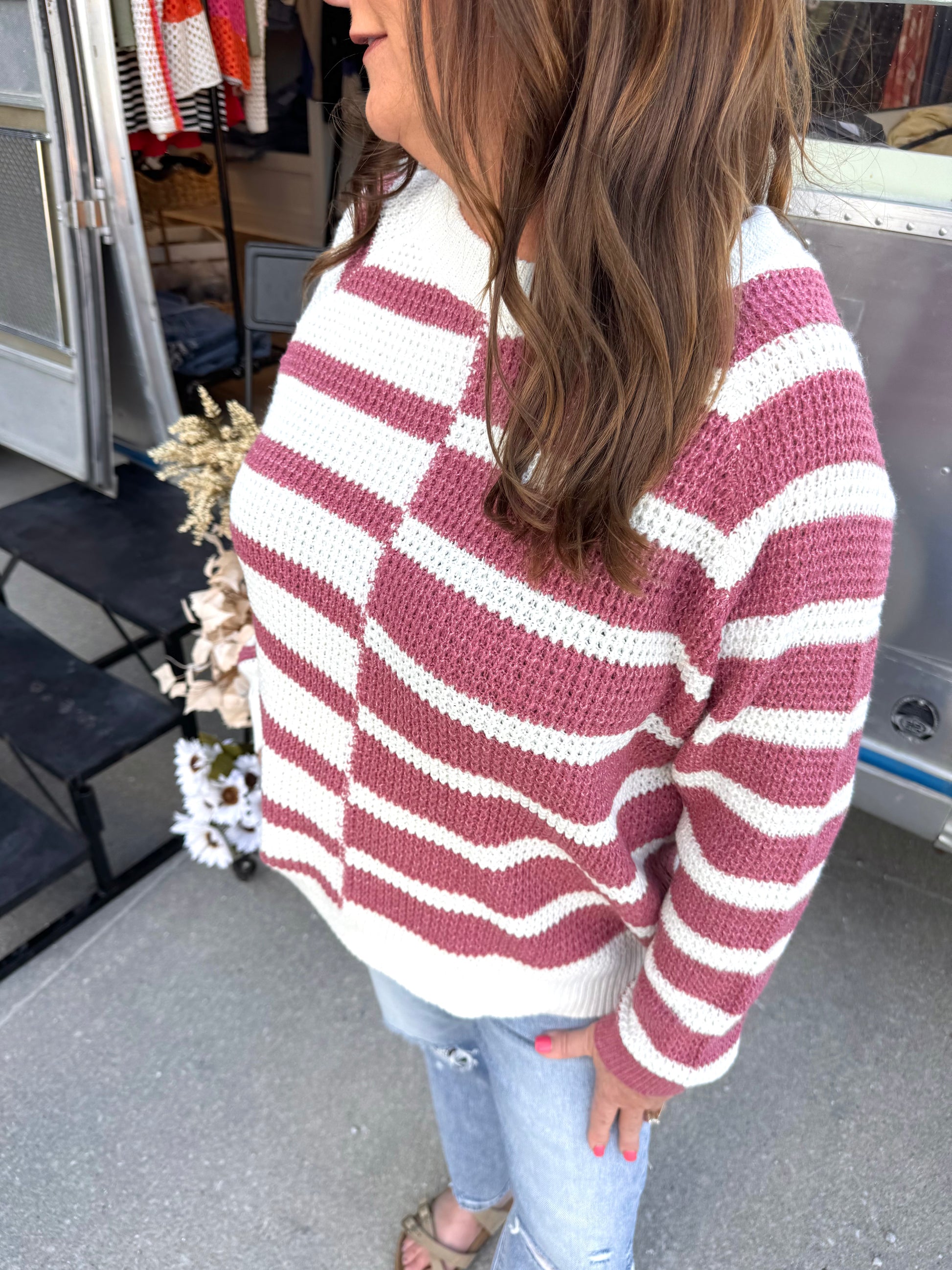 This rose-colored sweater features a wide crew neckline and a striped colorblock design. Its waffle texture and midweight fabric make it a cozy and comfortable choice for cooler days. True to size.