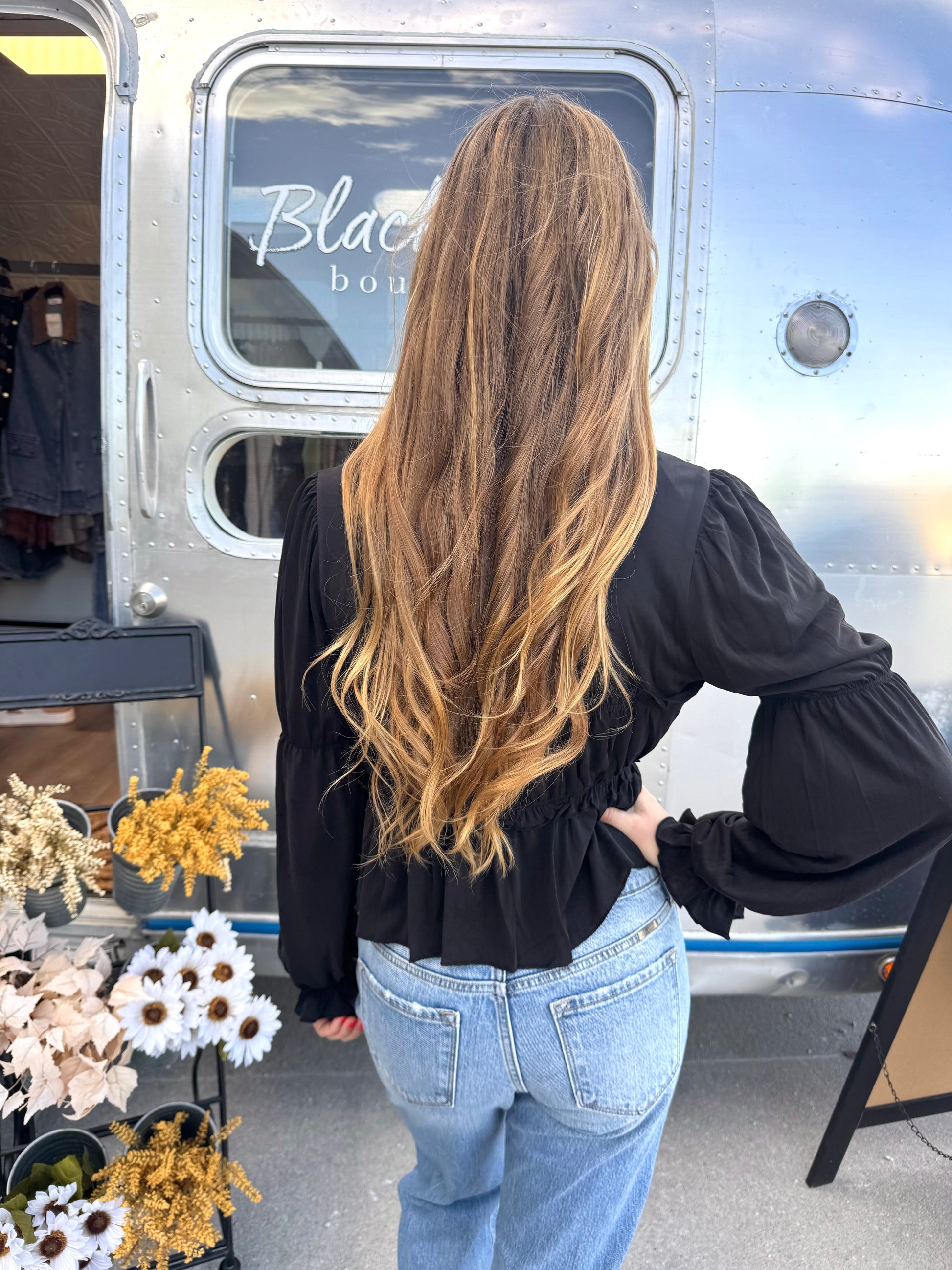 Experience gentle comfort and breathability with our soft, lightweight modal jersey fabric top. This top showcases a delicate shape enhanced by tiered shirring that flatters your figure. The long, puffed sleeves include subtle shirred cuffs for a refined silhouette, while the adjustable tie-front closure gives you the freedom to style it just the way you like. So cute for the cooler seasons.