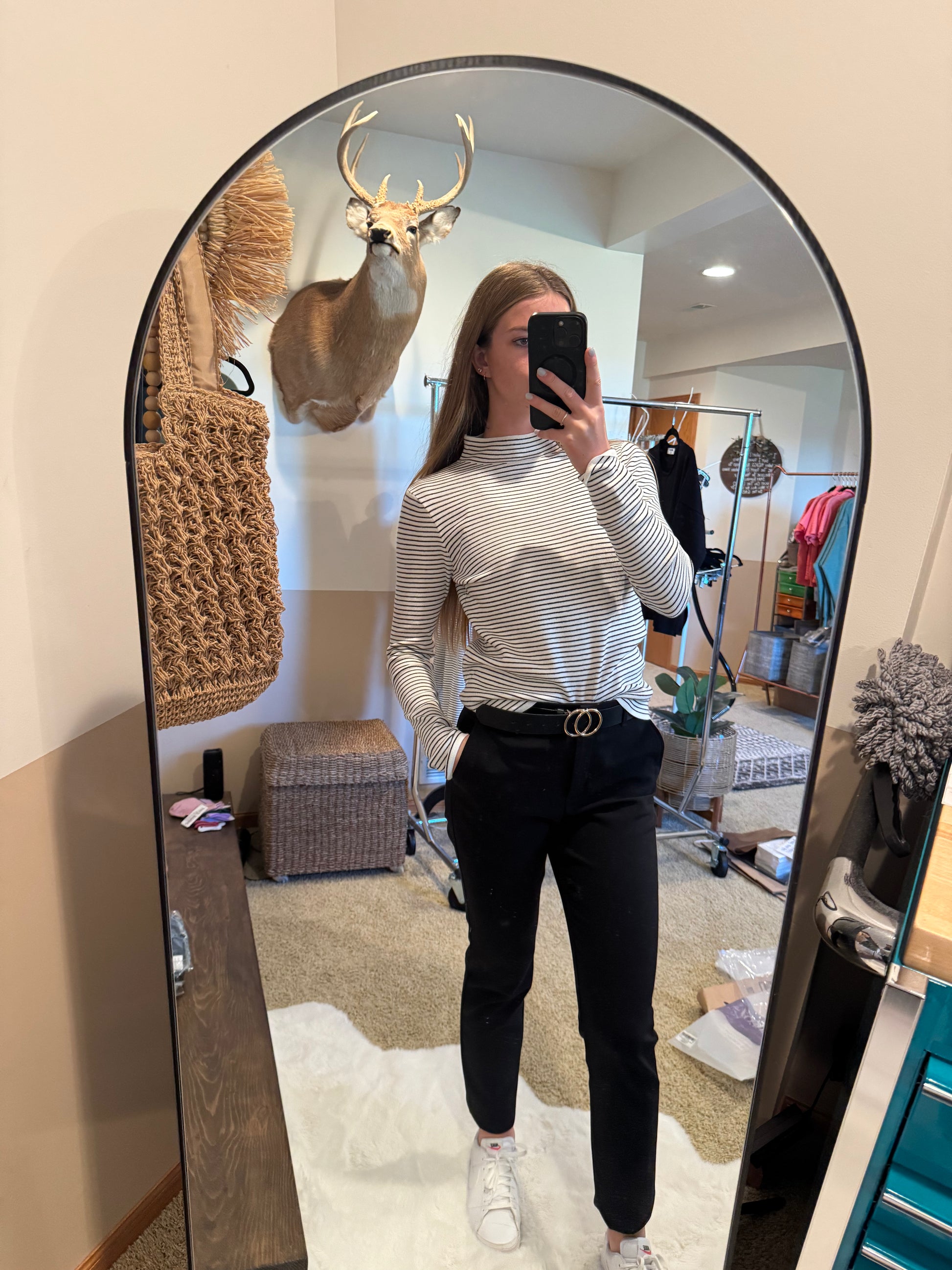 This pinstriped long-sleeve top features a mock neck design. It works well on its own or layered with a jack or vest for elevated style. Dress this up or down!
