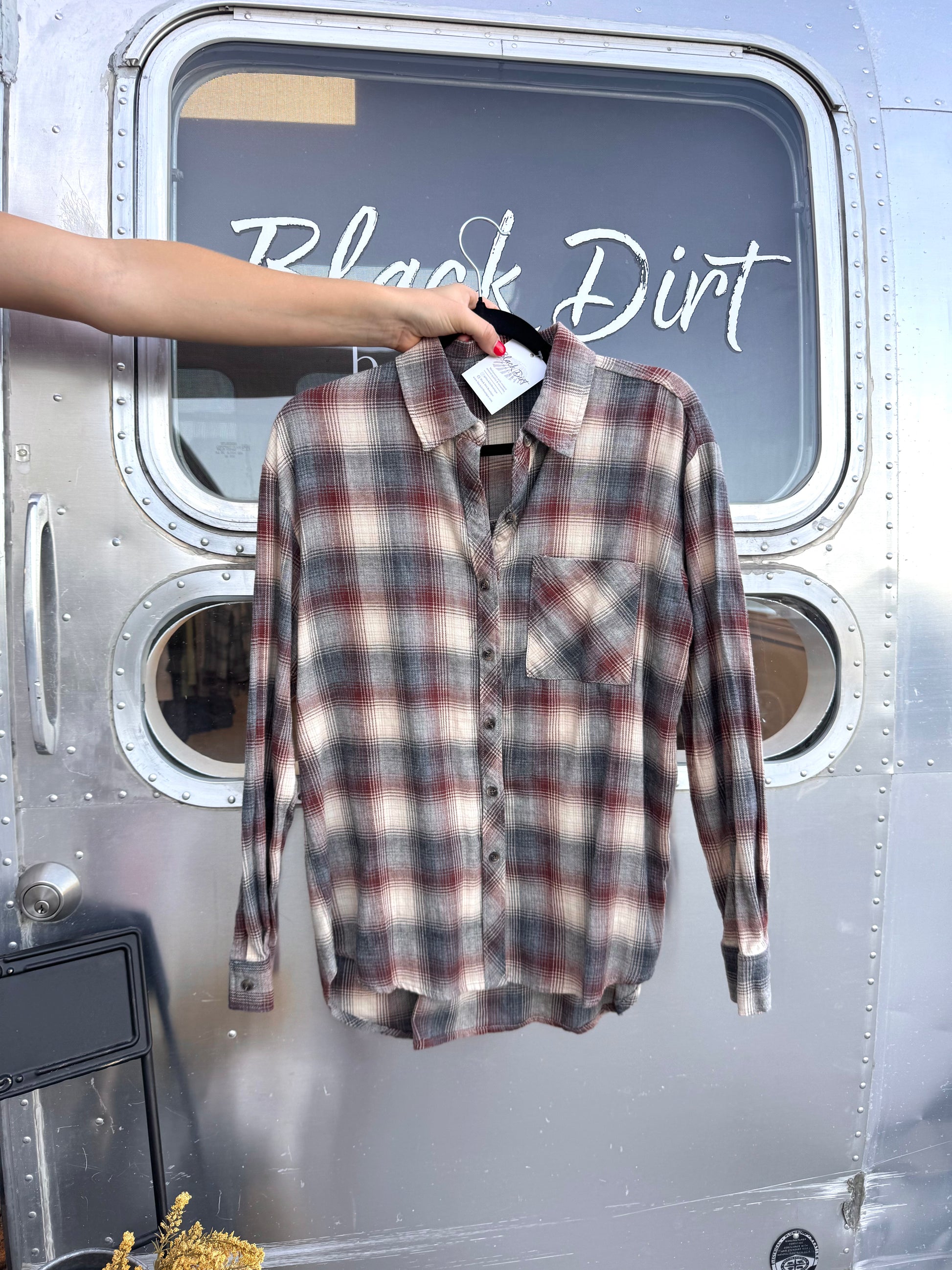 Experience the authentic comfort of 100% cotton flannel with a classic vintage look in a burgundy and grey blend. Perfect for wearing on its own or layering, this piece offers a relaxed, oversized fit that feels effortlessly cozy. Still runs true to size.