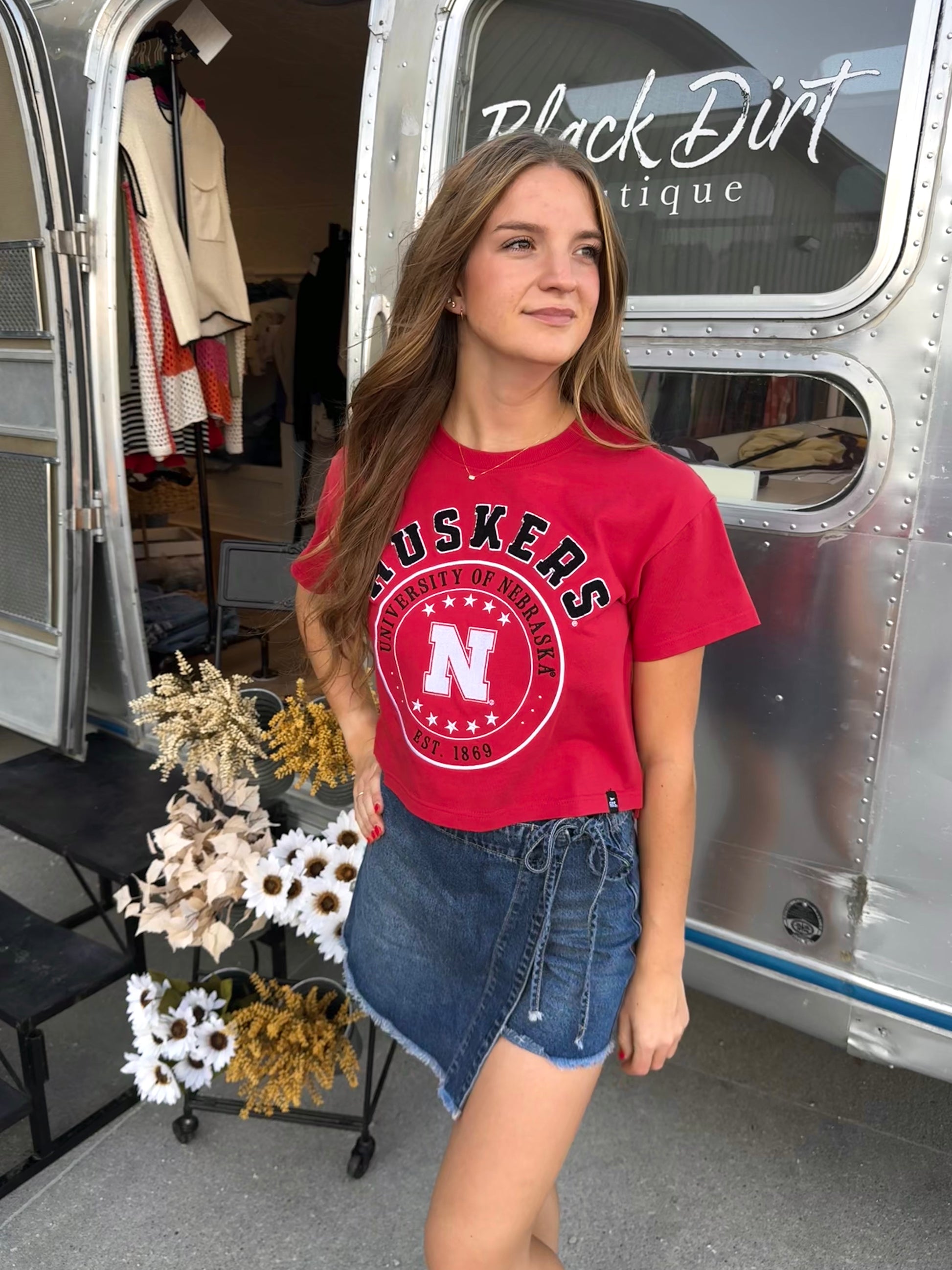 This heavyweight cropped T-shirt features a relaxed, boxy fit and soft, durable fabric. With a side slit and embroidered design, it combines vintage style with comfortable everyday wear.