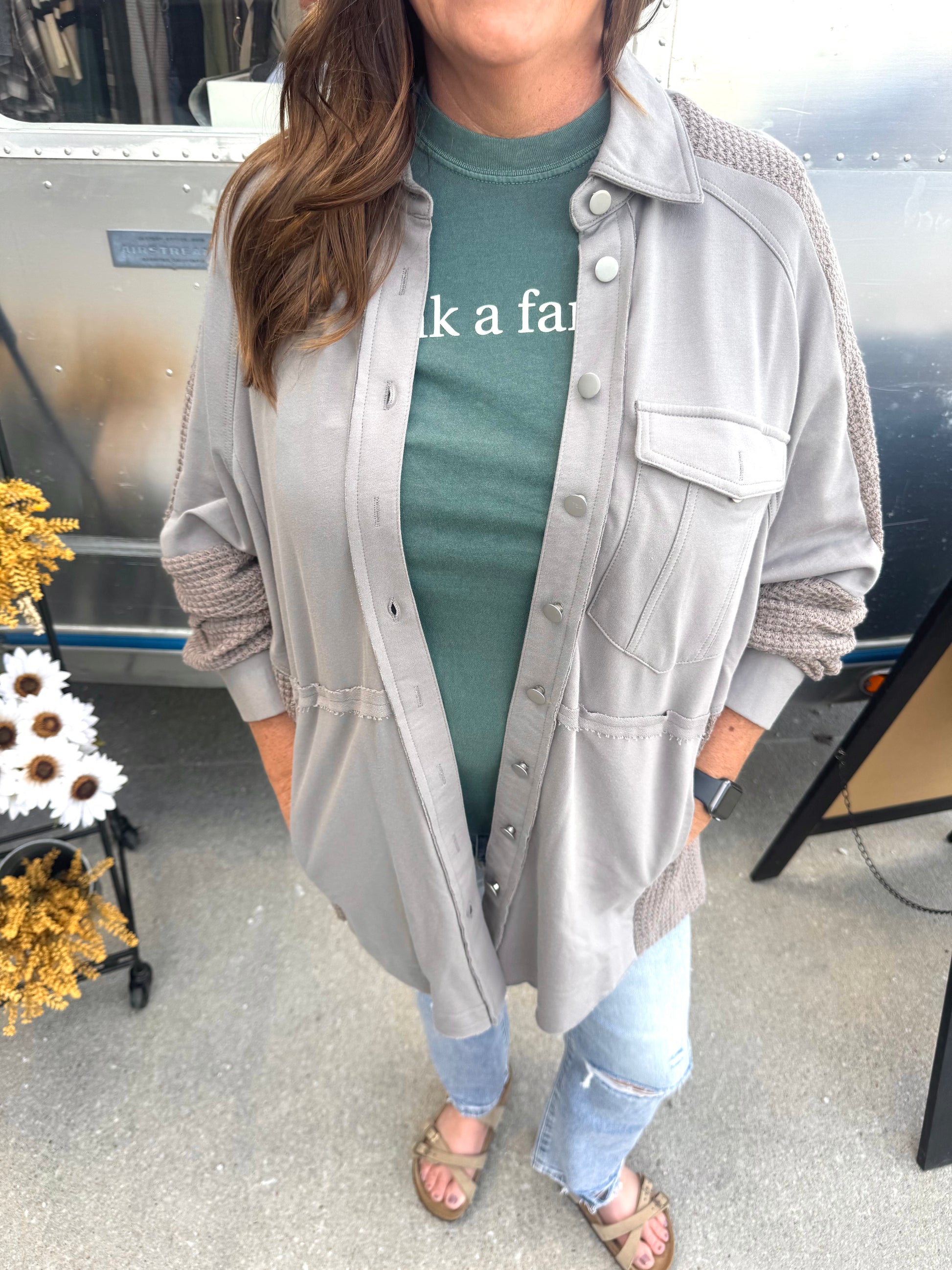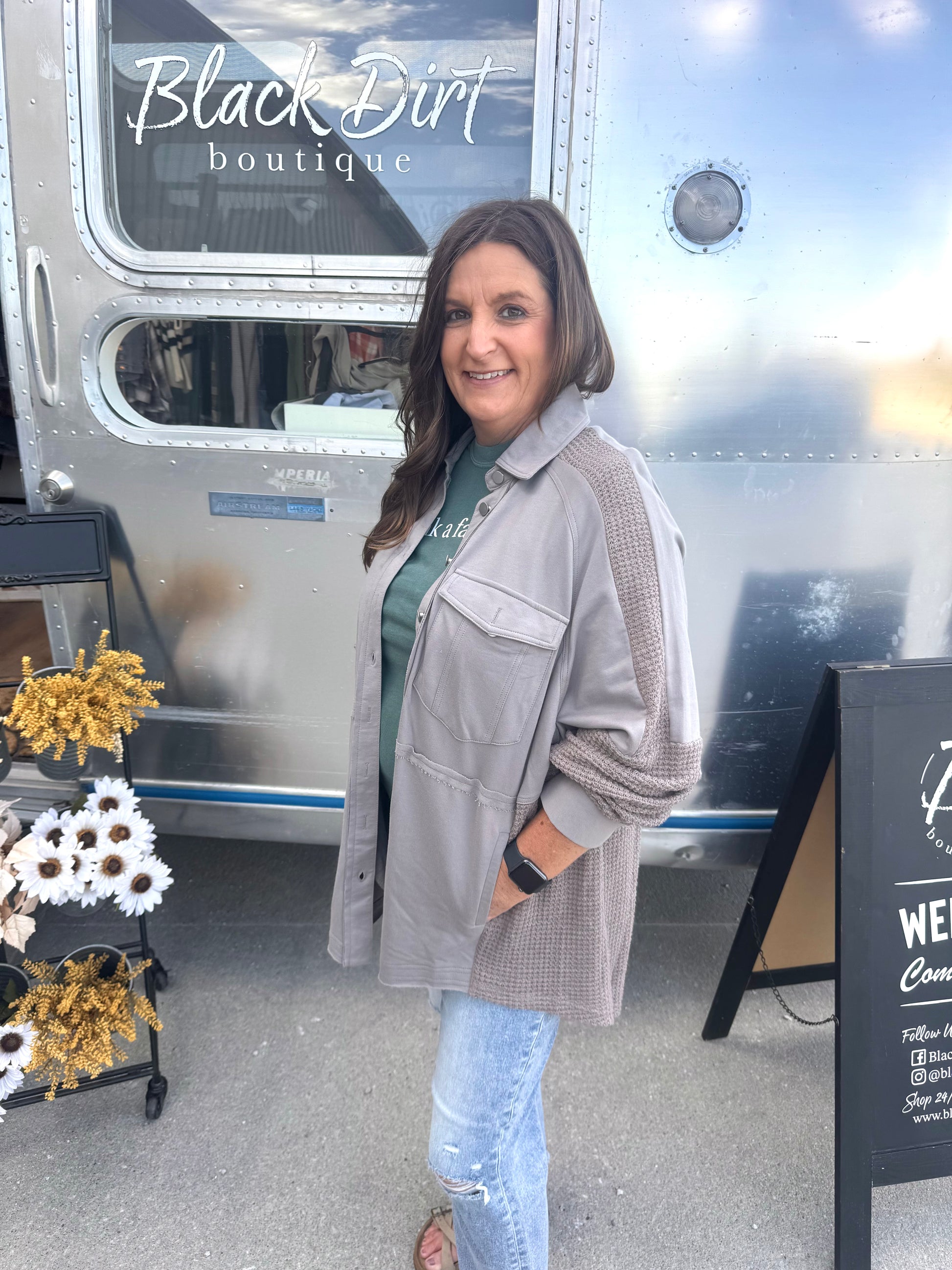 This Waffle Mix Shacket features a soft cotton-blend front and cozy waffle-knit back and sleeves. It has easy snap buttons, a relaxed oversized fit, and a handy chest pocket. Perfect for comfortable layering with added warmth and style.