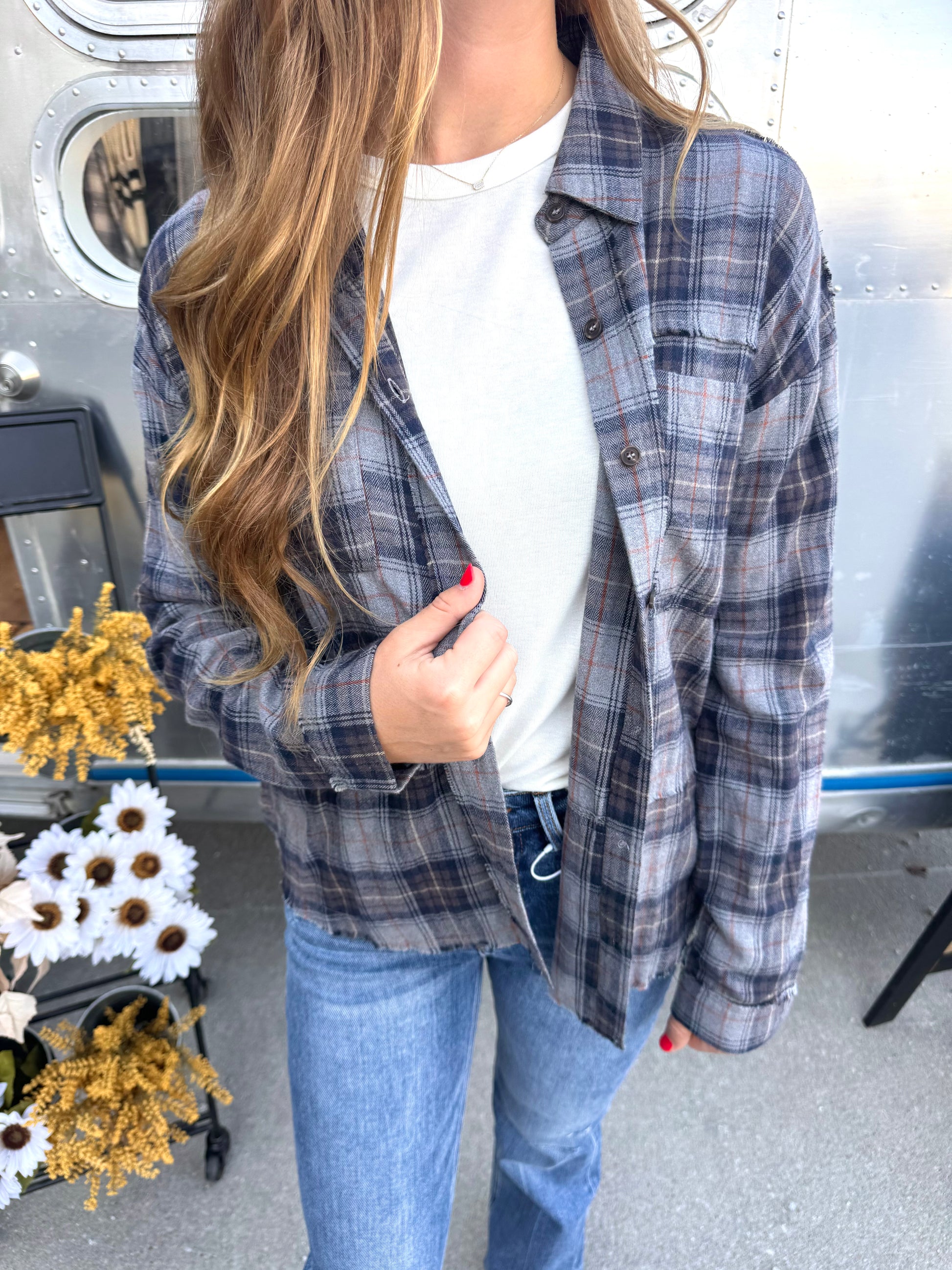 Hem & Thread collection. Features a relaxed fit with lightly worn frayed seams, crafted from soft, comfortable flannel. Perfectly lightweight for all-day wear this fall!