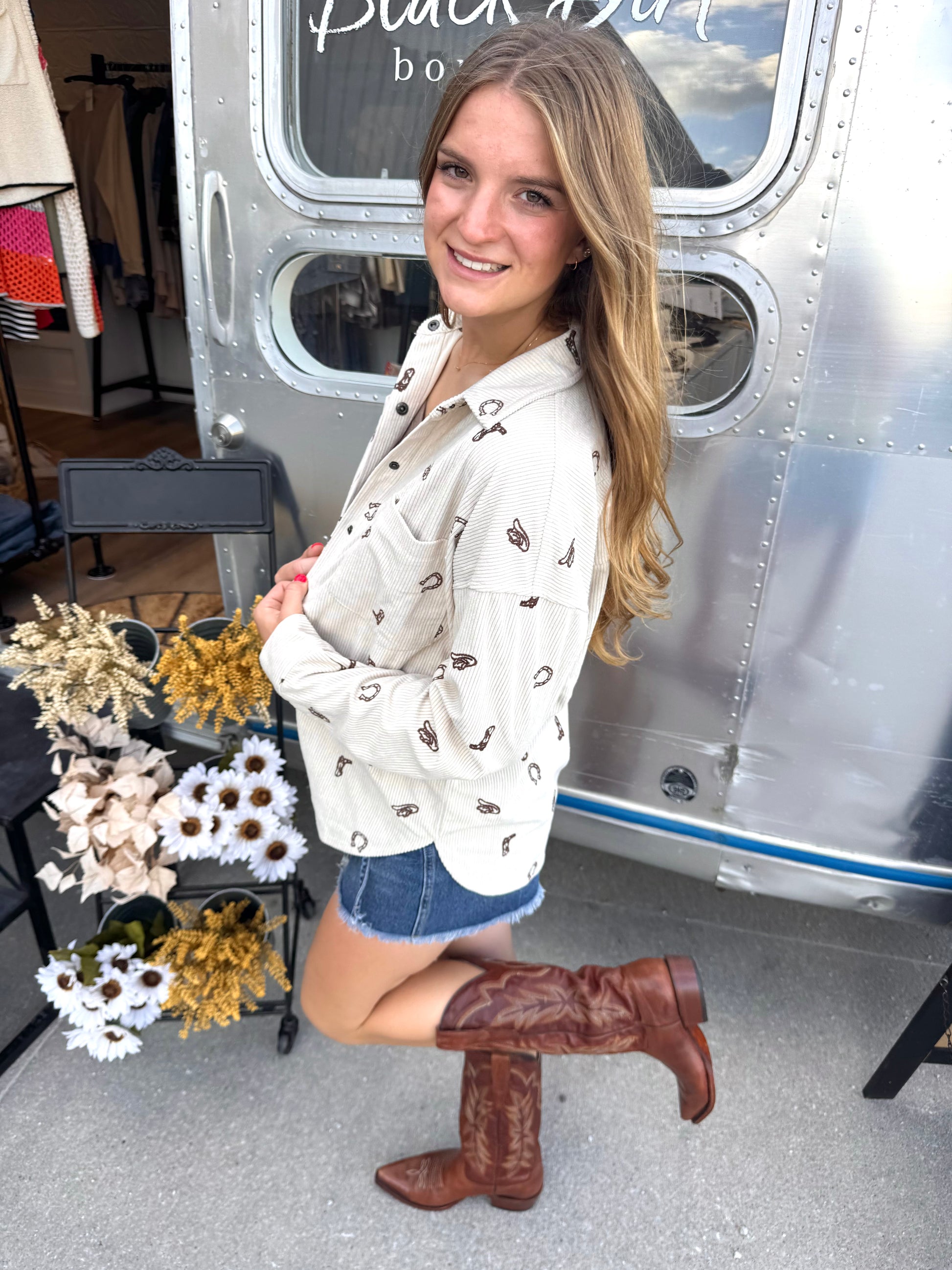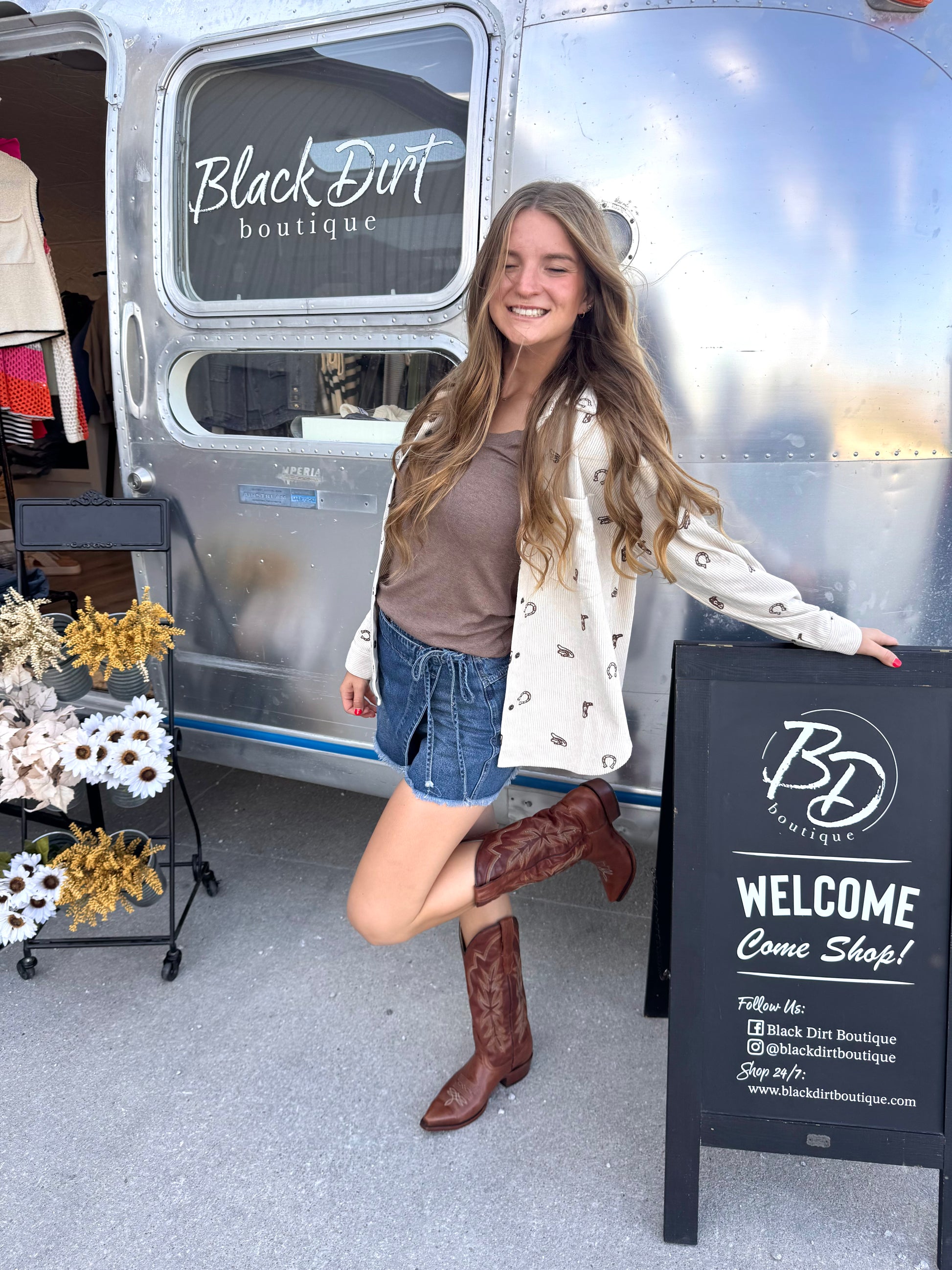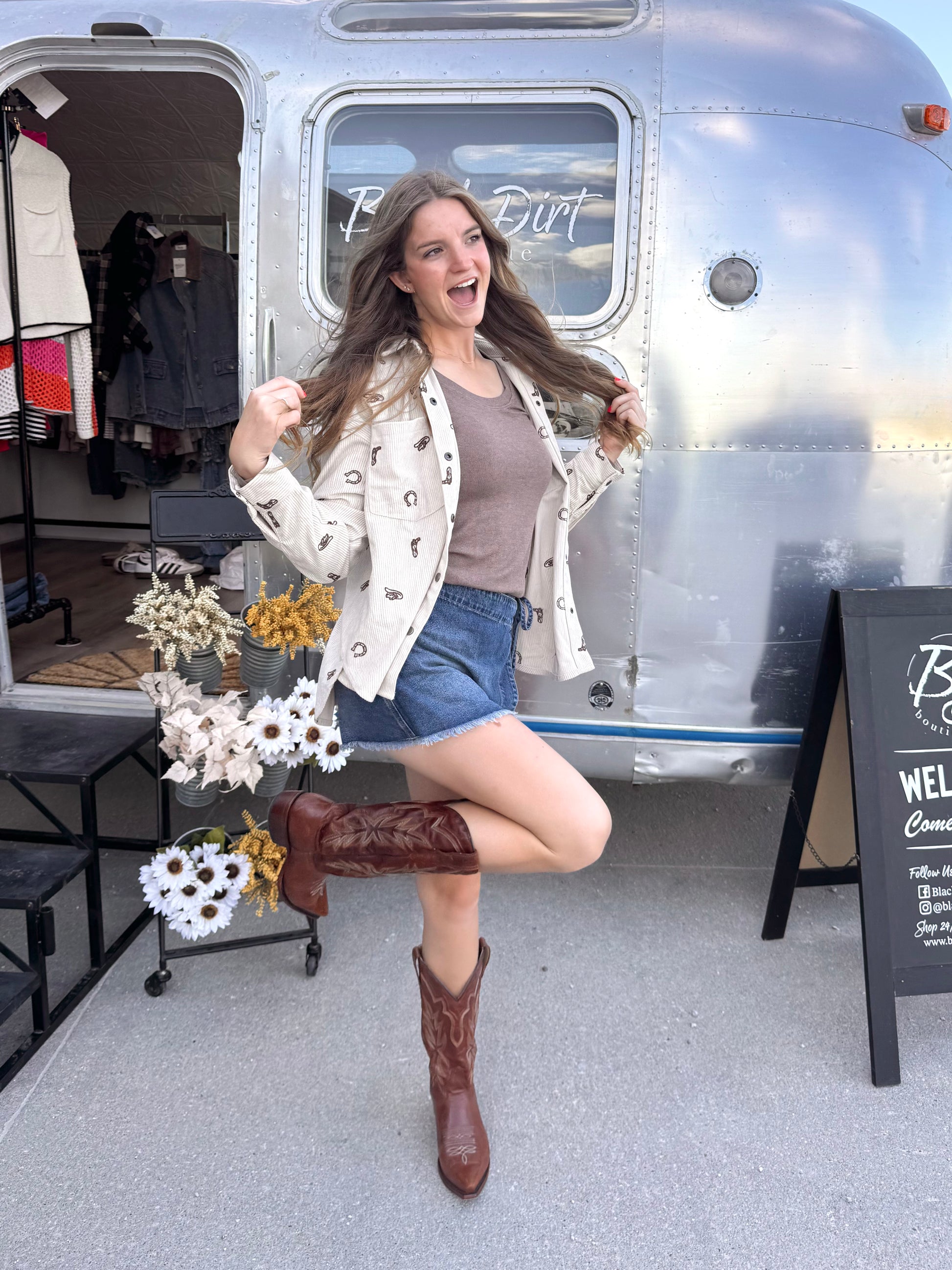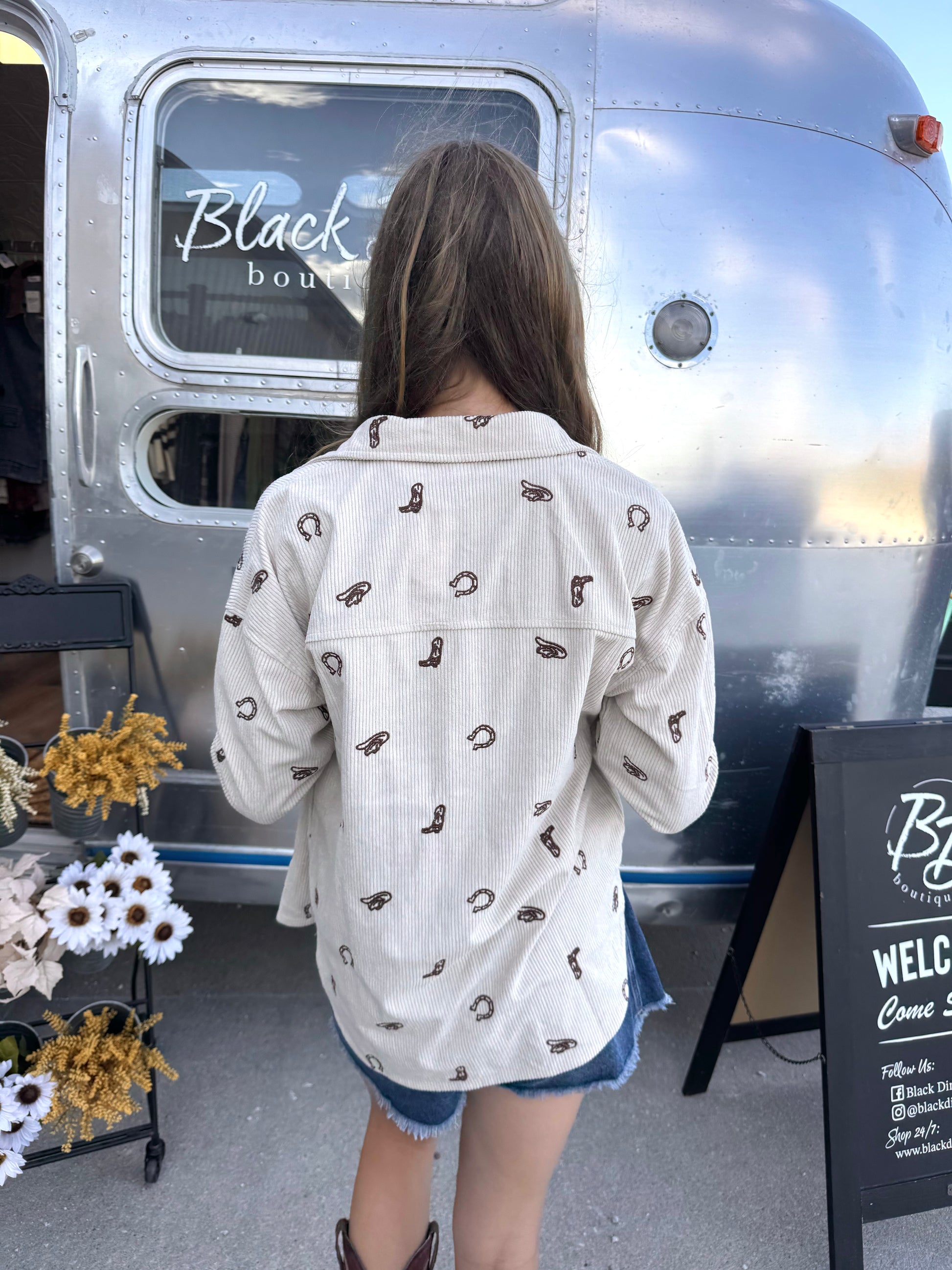 This tan corduroy shacket features charming western embroidery, perfect for adding a playful touch to your fall layers. It fits true to size and is available in limited quantities—grab yours before it’s gone!